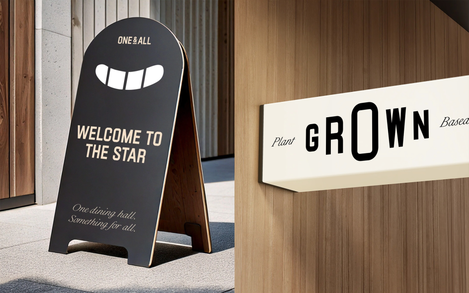 From signage and uniforms to digital menus and in-app comms, everything has been designed to be flexible, usable, and rooted in campus life. Even the name is malleable: some campuses lead with One&All as the master brand, while others position it as a supporting motto ("by One&All, for One&All") alongside local branding.